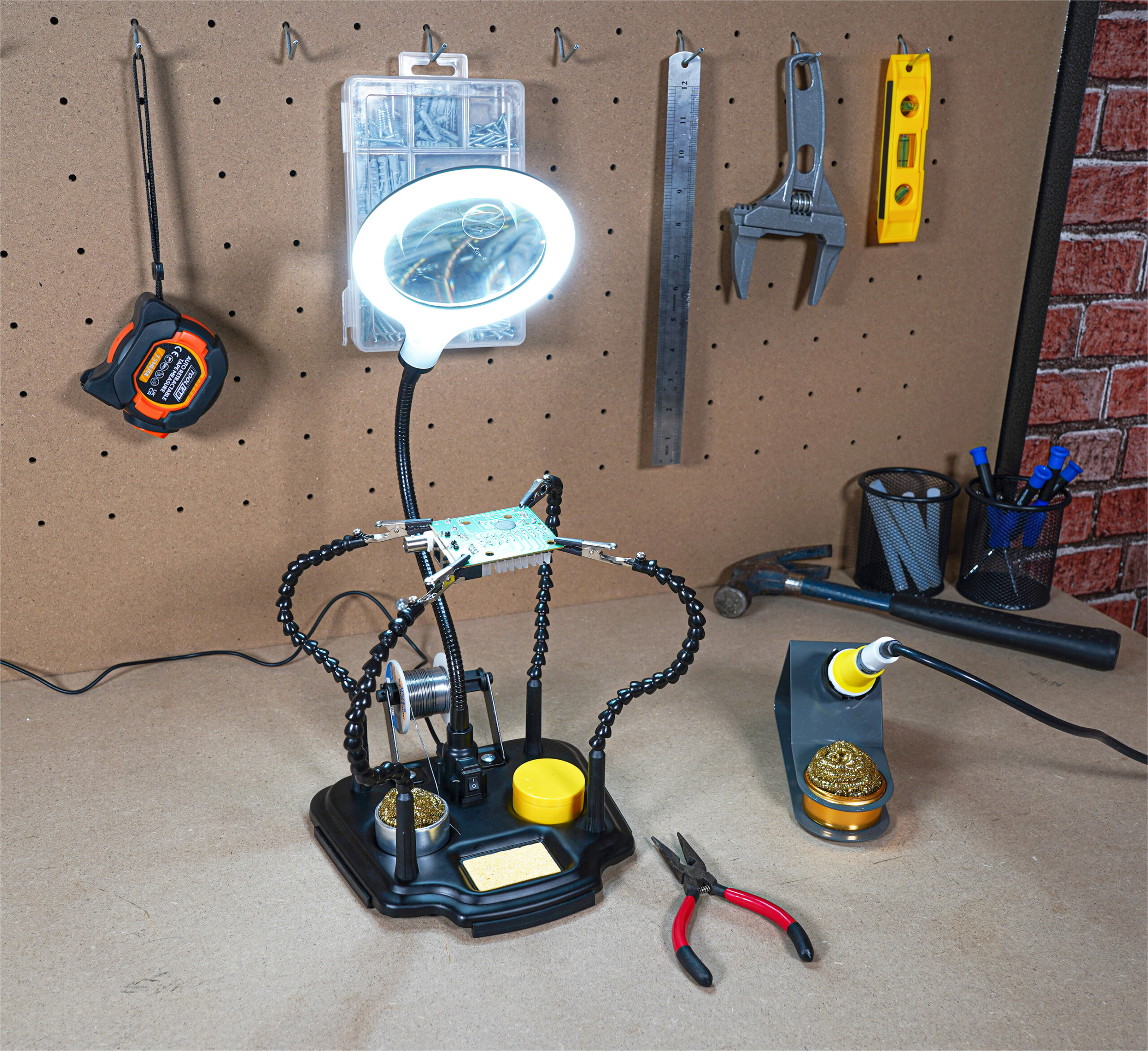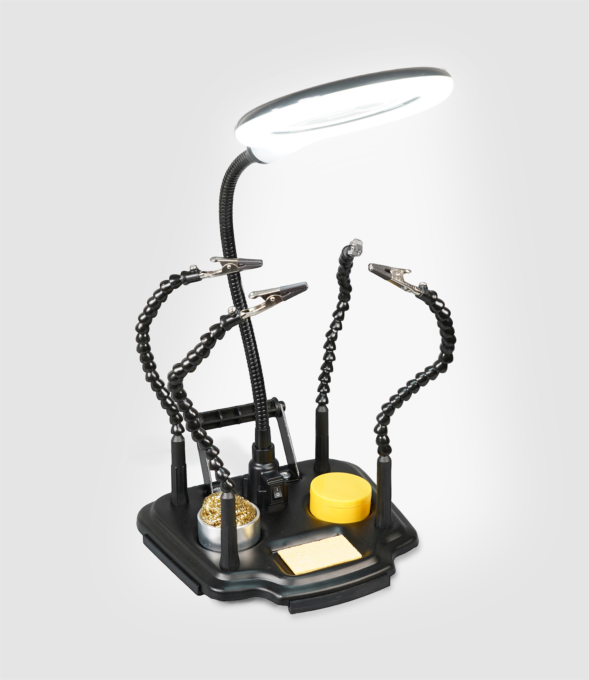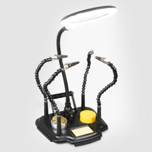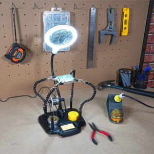 Introducing the Eagle helping hands USB powered 4 x magnifier with built-in fine work magnifier and LED Light all mounted on a flexible gooseneck mount, Your essential tool for precision Work! Are you tired of struggling with intricate tasks that require precision and detail? Look no further! Our helping hands magnifier is the perfect solution to make your work easier and more accurate. Fitted with four flexible gooseneck arms terminated with strong crocodile clips allowing for easy and accurately positioning of PCB boards and other items. The product further features a rotating holder for solder, solder tip cleaning ball, weighted base, on off switch, Rosin and USB-USB-C lead.