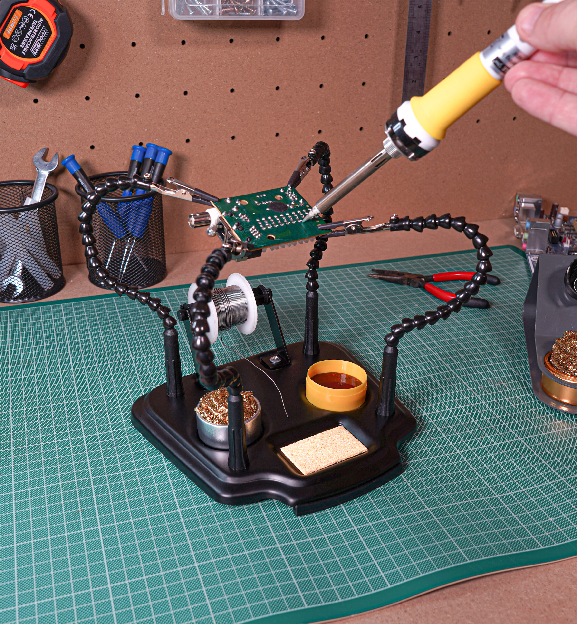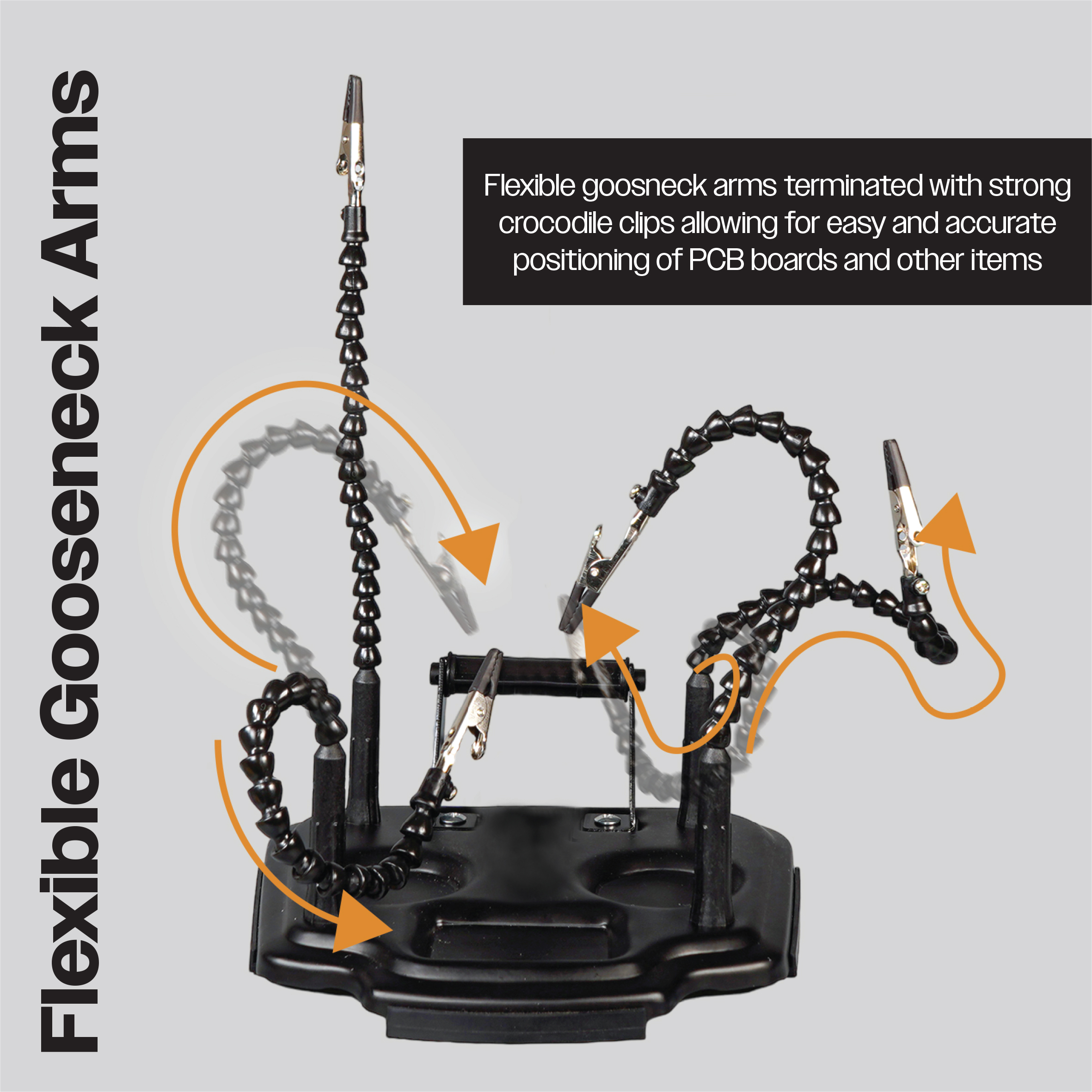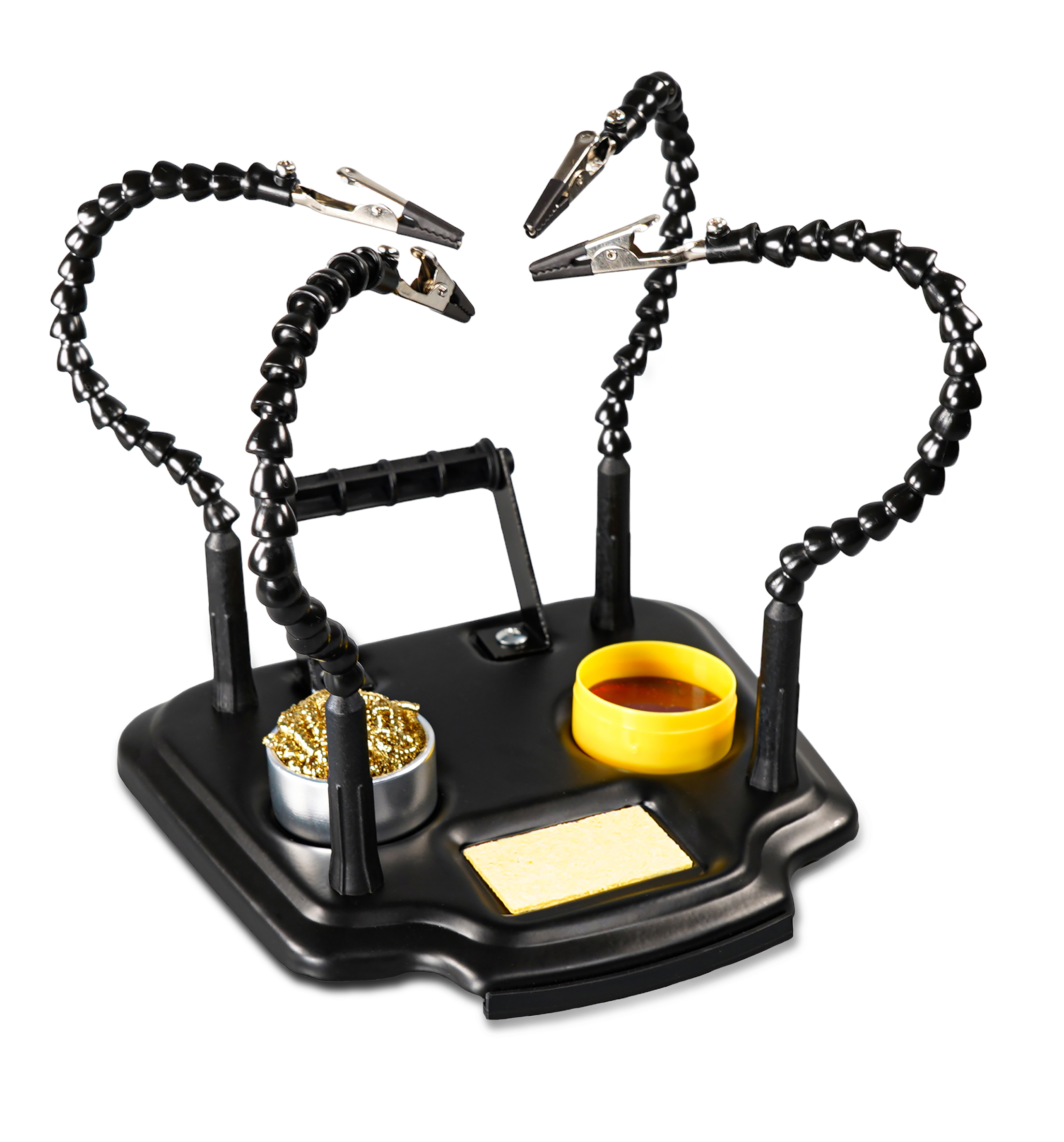Introducing the Eagle helping hands. Your essential tool for precision Work! Are you tired of struggling with intricate tasks that require precision and detail? Look no further! Our helping hands is the perfect solution to make your work easier and more accurate. Fitted with four flexible gooseneck arms terminated with strong crocodile clips allowing for easy and accurately positioning of PCB boards and other electronic items. The product further features a rotating holder for solder, solder tip cleaning ball, weighted base, on off switch and Rosin.