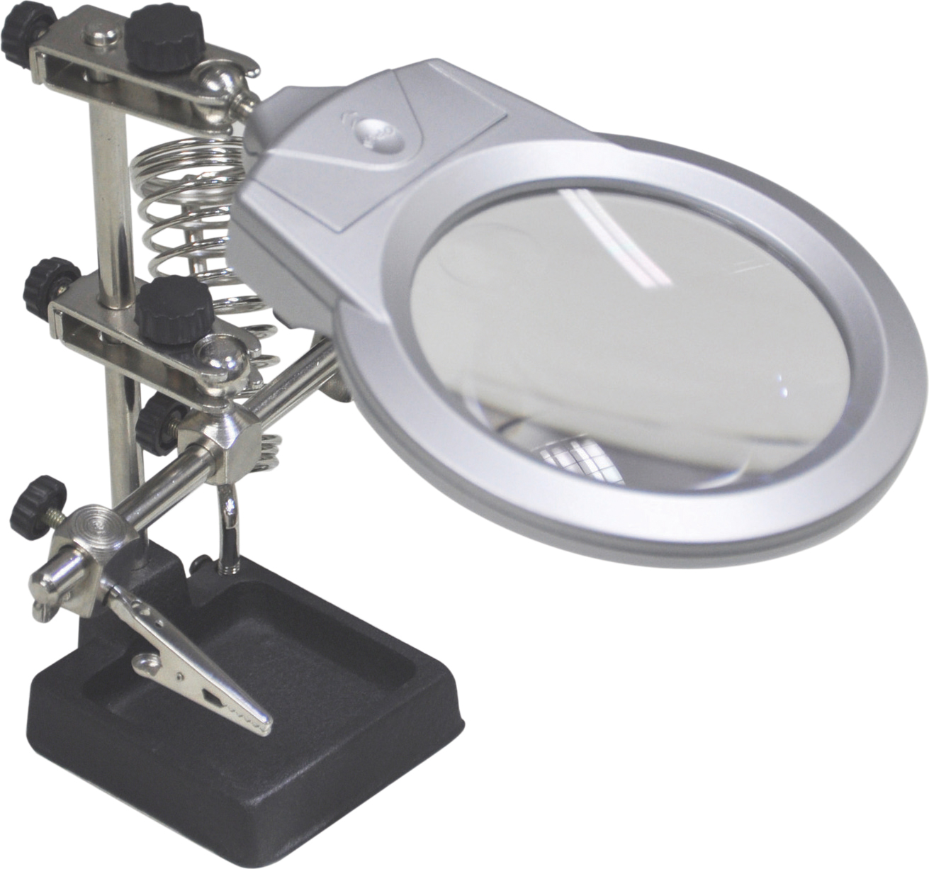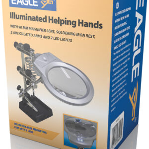 The Helping Hands tool features a round 90 mm magnifier lens (2 x magnification) and includes 2 LED lights (3 x AAA, not supplied). With a weighted, cast iron base for stability and 2 articulated arms with crocodile clips for gripping, this model also features an adjustable soldering iron rest, making it the ideal tool for electronics and other soldering projects.