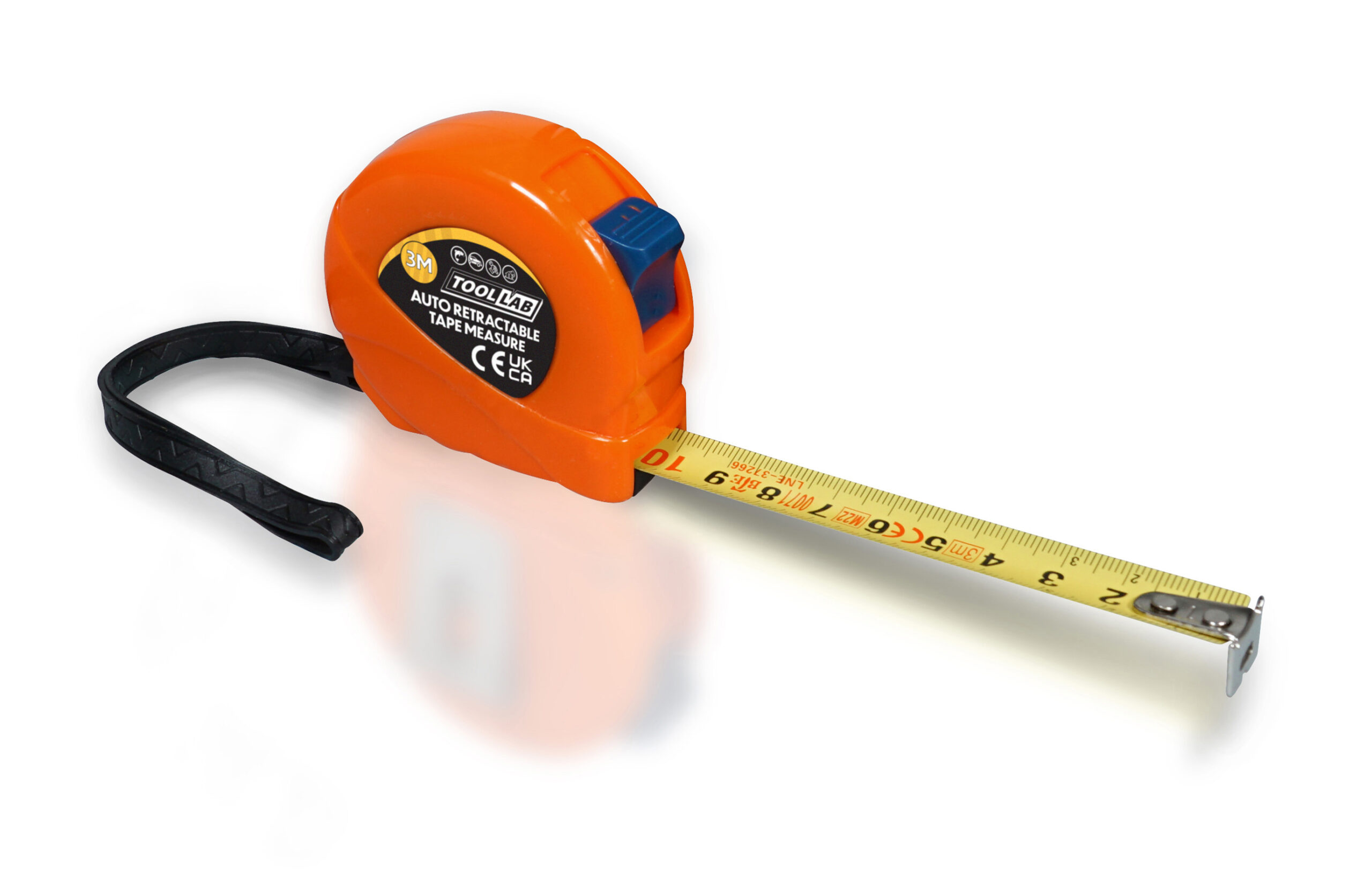 A auto retractable 3m tape measure. Get accurate and quick measurements when undertaking both DIY and professional projects.The tape is 16mm in width and made from 11s grade 50 carbon steel making it high strength and flexible. A sturdy lock mechanism holds the tape in place for accurate measurements.A metal hook at the end of the tape allows for ease of measuring. The tape features single sided metric graduations in centimeters. The tape can be extended and wound in quickly without kinking. The tape has rubber lanyard and a clip on the back so that it can be secured to belts or tool boxes.The rugged case is made from environmentally friendly ABS plastic.