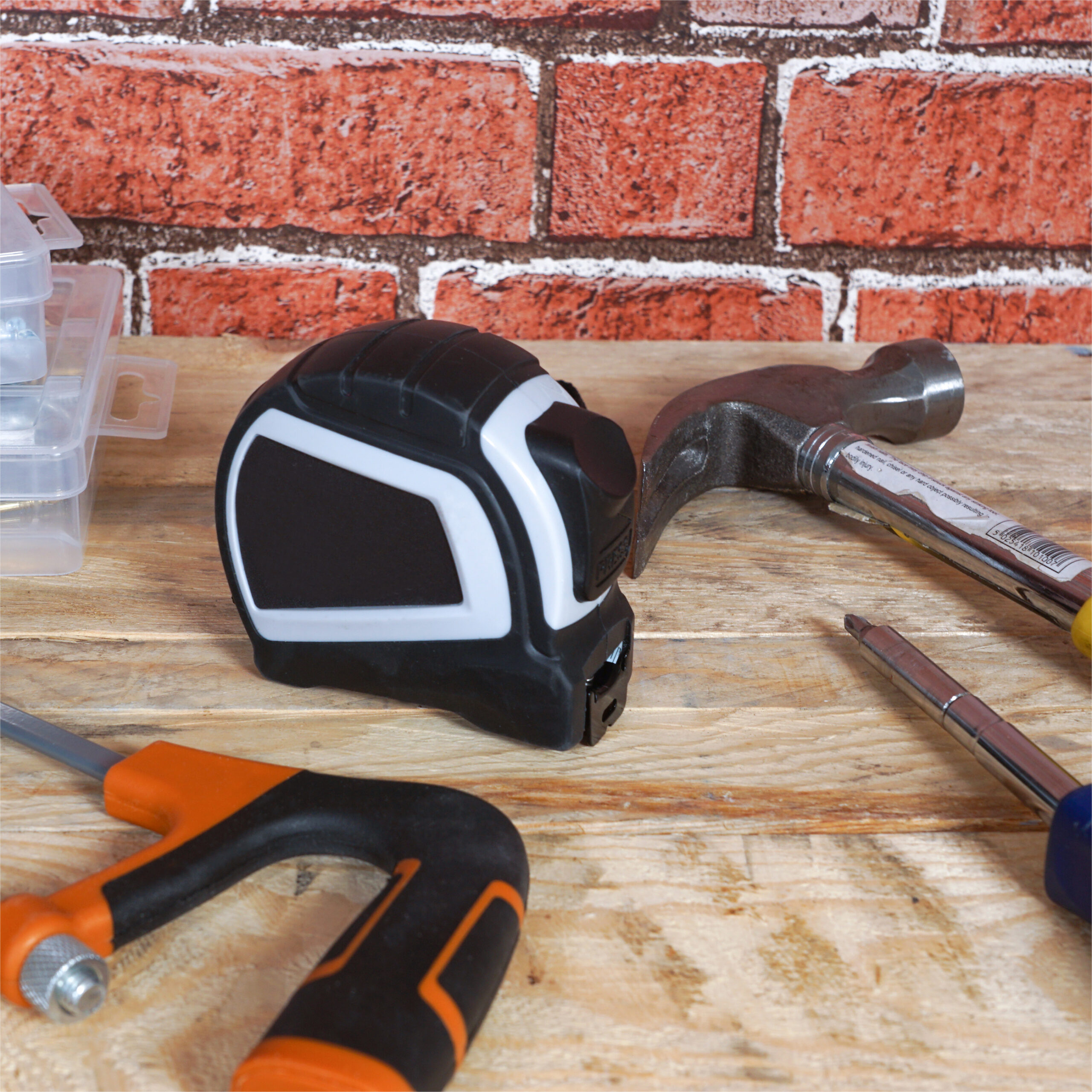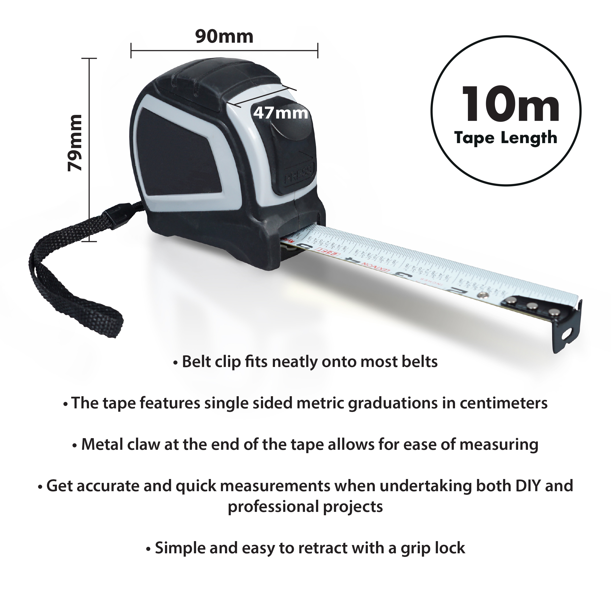 A auto retractable 10m tape measure. Get accurate and quick measurements when undertaking both DIY and professional projects. The tape is 25mm in width and made from 11s grade 50 carbon steel making it high strength and flexible. A sturdy lock mechanism holds the tape in place for accurate measurements. A metal hook at the end of the tape allows for ease of measuring. The tape features double sided metric graduations in centimeters. The tape can be extended and wound in quickly without kinking. The tape has rubber lanyard and a clip on the back so that it can be secured to belts or tool boxes. The rugged case is made from environmentally friendly ABS plastic.