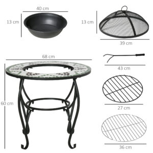 A 3-in-1 design camping fire pit, bringing you tasty food, toasty warmth and a touch of elegance to your garden and outdoors: this firepit BBQ table from Outsunny. A fire poker is included in the garden fire pits to safely move charcoal and other heating fuel. The mesh lid protects against flying sparks. The mosaic round outer is pretty. Do more with the garden fire pit.