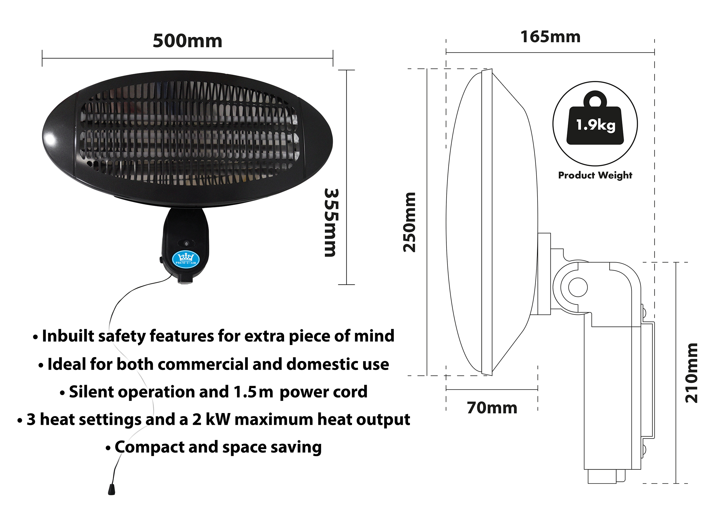 Enjoy your garden in any season with this affordable 2 kW Wall Mountable Patio Heater. Featuring 3 targeted heat settings and an adjustable head, this space-saving heater is in fact ideal for both domestic and commercial use. Its oval shaped design and black colour assert style, silent operation, pull cord switch and 1.5 m power cord mean minimum fuss when in use.