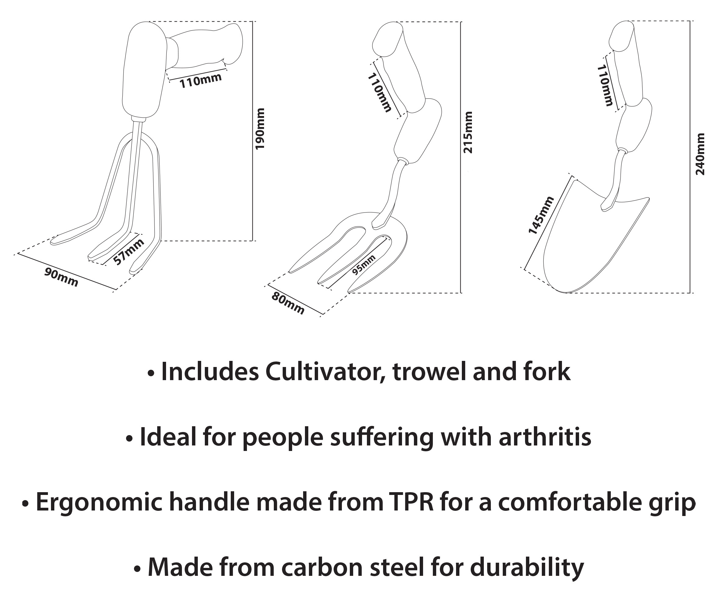 Discover the convenience of this 3-piece gardening set, featuring a cultivator, trowel, and fork. Made from carbon steel, these tools are built to last. The ergonomic handles, made from TPR, provide a comfortable grip, making them ideal for individuals with arthritis.