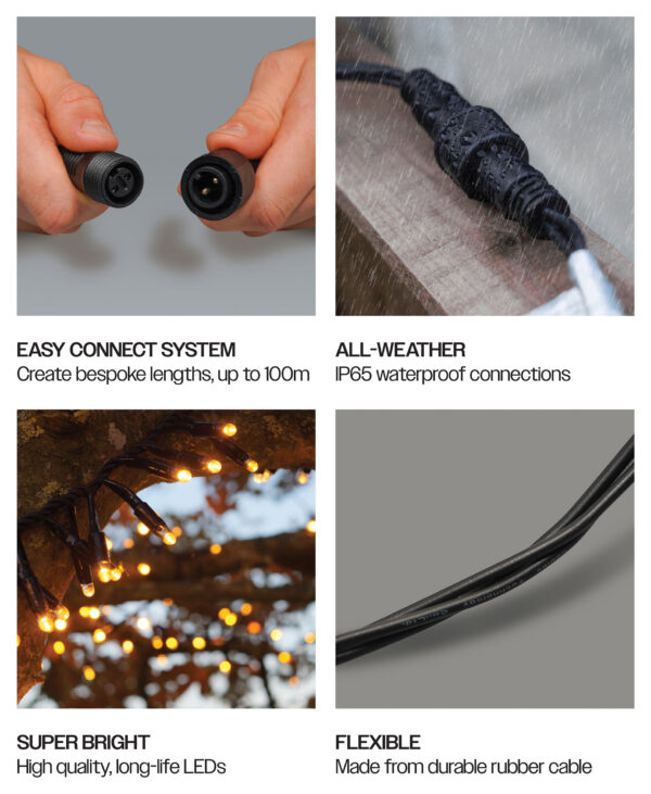 With easy-to-connect plugs, you can easily customize the length of the cluster lights to suit your needs. Whether you want to create a dramatic lighting display or add a subtle glow to your outdoor space, these connectable cluster fairy lights are the perfect solution. Cluster Christmas lights are the perfect way to add a touch of magic to your holiday decor. These LED lights are clustered together on a string, creating a stunning garland of lights. Easy to install and versatile, they can be used inside or outside to create a warm and cozy ambiance. The lights are available in multiples of 5m lengths, allowing you to create the perfect ambiance for any room or occasion. Whether you need a few extra meters for a specific area or want to extend your lighting throughout a larger space, our Eagle Connect system has you covered. Simply order the total length you require, and we will provide you with the appropriate number of 5m lengths to get the job done. With our Eagle Connect light systems, the possibilities are endless.