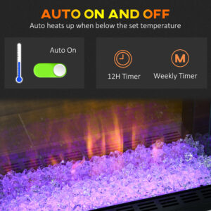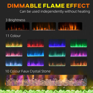 - Flame is adjustable between three different brightnesses, 11 flame colours and ten faux crystal stone colours