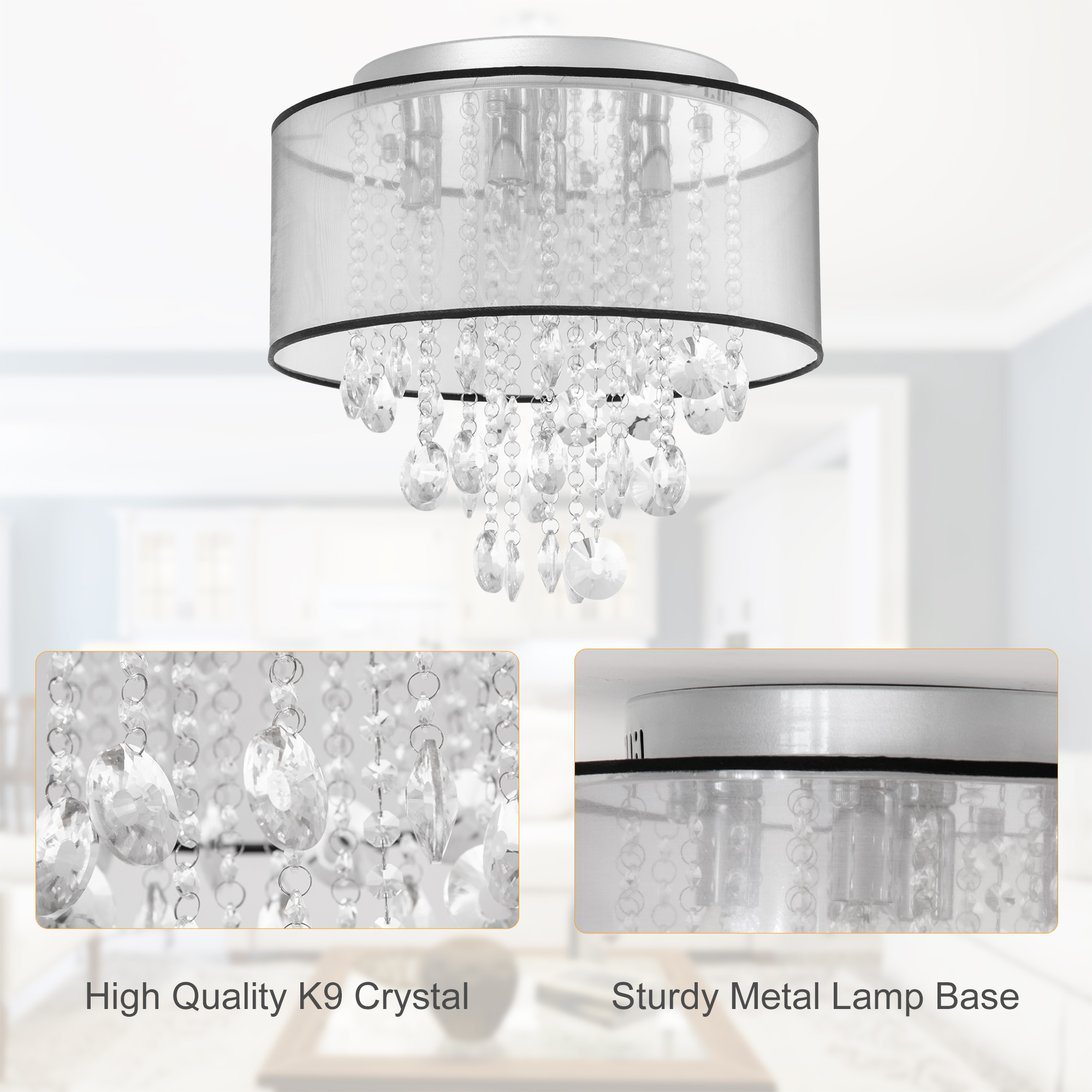The crystal ceiling lamp from HOMCOM with modern design and luxurious appearance, it’s great for your home and office. High quality steel and K9 crystal glass guarantee durable use. 30 strings of different shaped crystal droplets make the chandelier shinny like diamonds. This flush mount will be an eye-catching of your home. Besides, it is suitable for hallway, bedroom, dining room, living room and adds glamour to every corner of your house!
