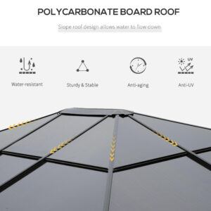 This outdoor gazebo is your best choice to relax and enjoy parties. The polycarbonate hard roof provide UV protection and double sided zipper curtains create a comfortable space. Its large sizing provides enough shelter for yourself and several other people. You can set up this gazebo in the backyard or poolside, have a nice gathering with friends or family. Let this practical gazebo to improve your happiness and life quality.