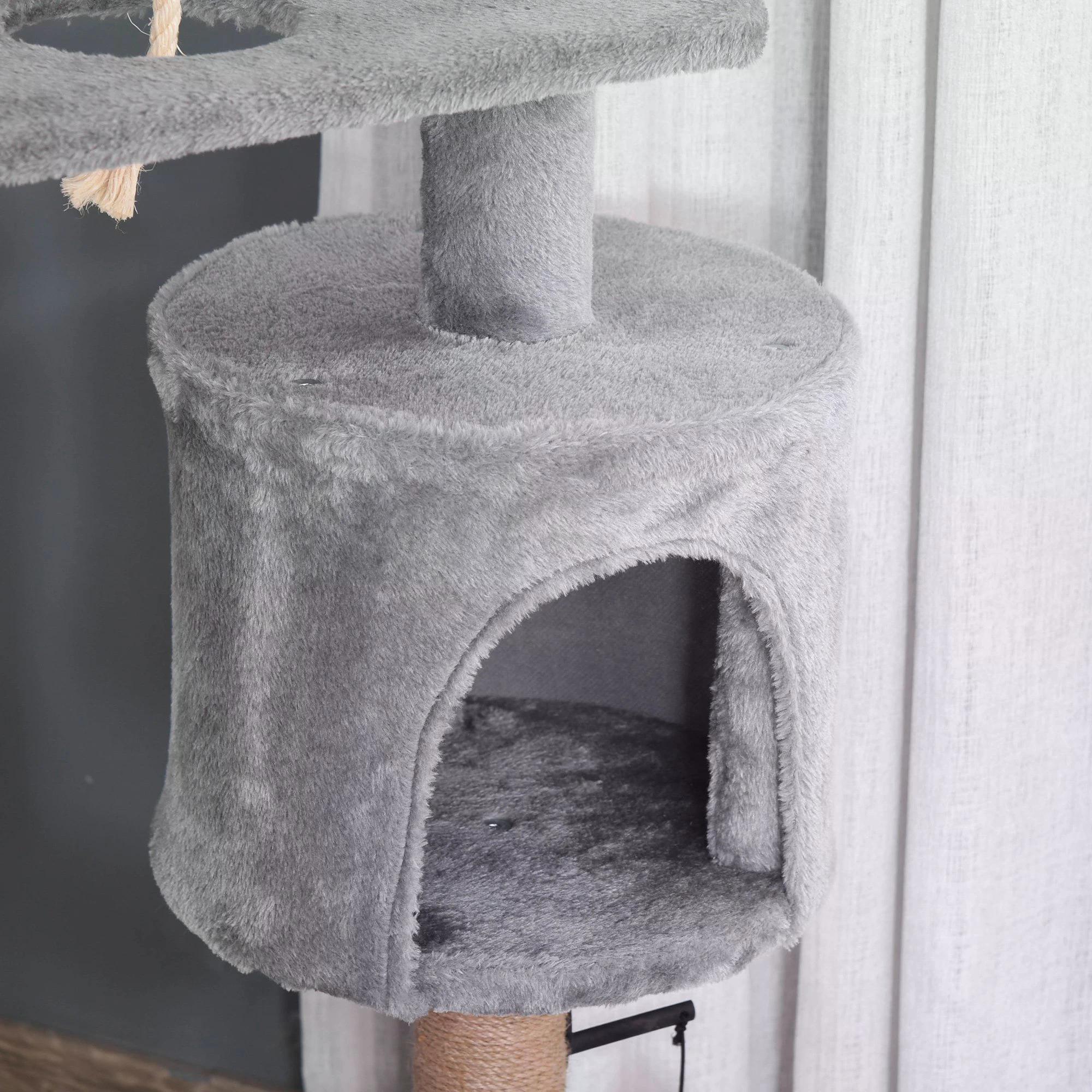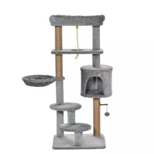 - Features a house, three perches, large top bed, side hammock, teasing rope and a dangling ball