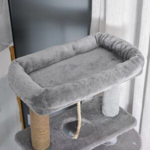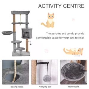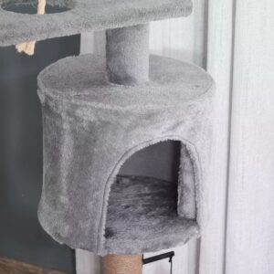 Keep your cat/kitten happy with this cat tree for indoor cats from PawHut. This large cat tree features multiple platforms to lounge on, including the middle house, side hammock, top cushioned bed and multiple perches. The scratching post gives your pet somewhere safe to sharpen their claws and saves your furniture from damage. Rest, play and exercise, this tall cat tree is a place where they can be all day and night.