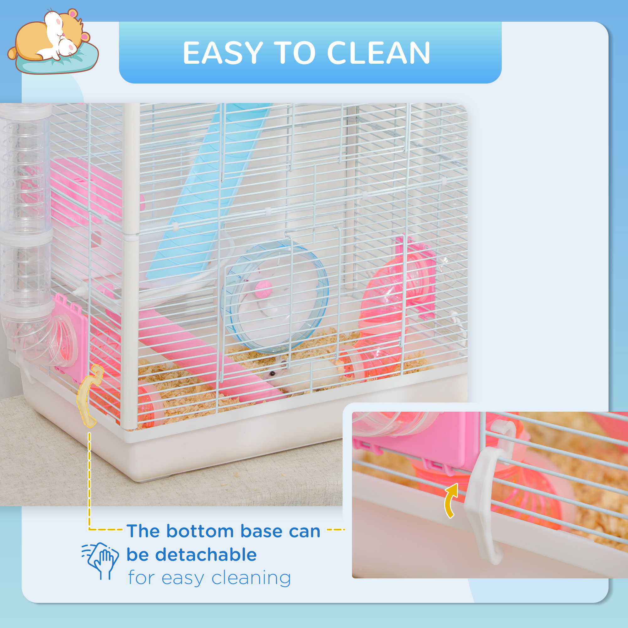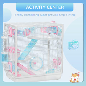 With this PawHut hamster cage with tubes, small pets have a safe and active space to call home. With three tiers, there are tunnels, two ramps and an exercise wheel, there’s lots for pets to do, keeping them active, healthy and occupied. When hungry or thirsty, they’ll have a food bowl and water bottle to keep them satisfied. Two doors for easy access, whilst the detachable bottom makes cleaning simple. Finished with steel wires to let air flow through, keeping their space cool and ventilated.