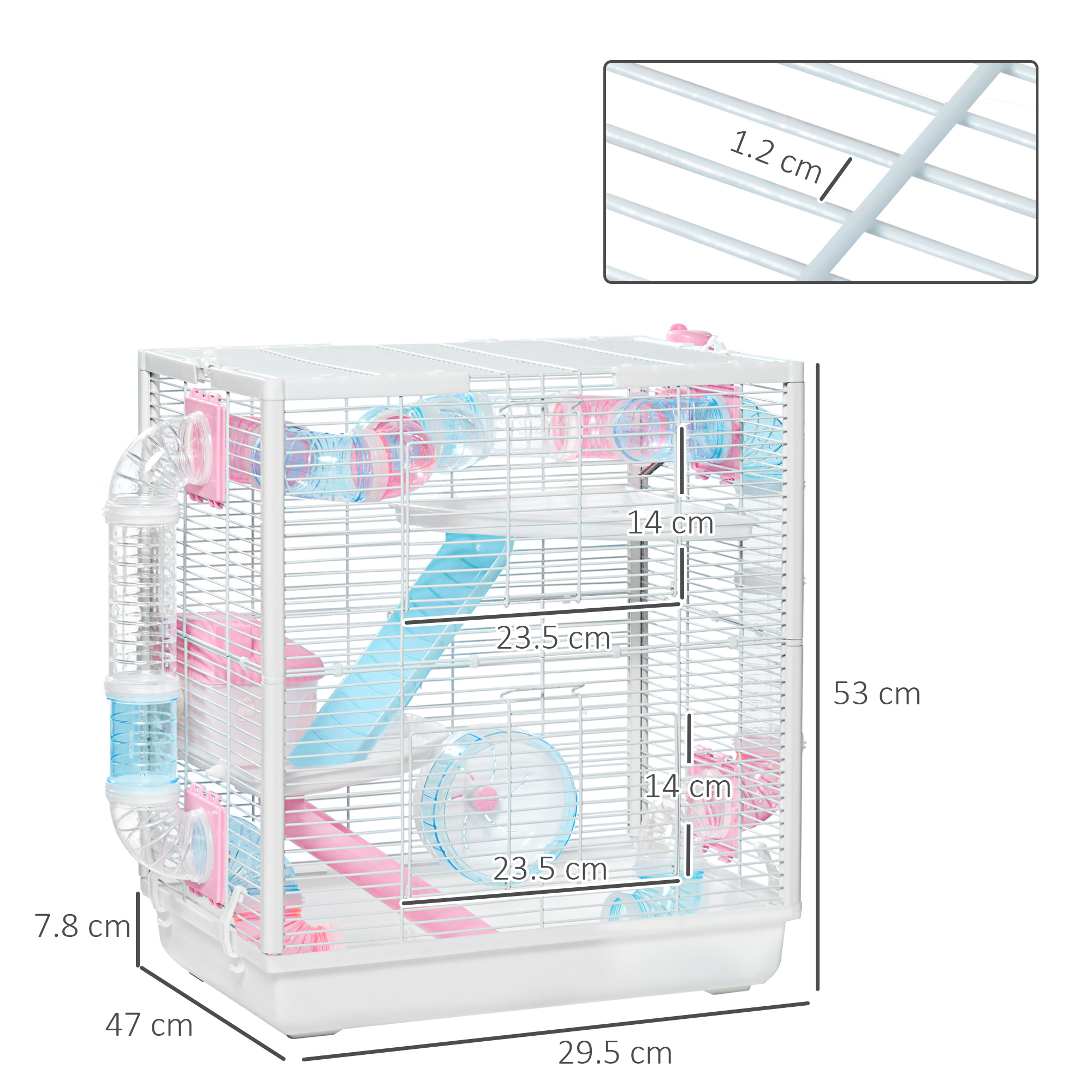 - Dimensions: 53H x 47L x 29.5Wcm. Fan shaped platform: ??23.5cm. Door: 14H x 23.5Wcm. Bottom: 7.8H x 47L x 30Wcm. Hut: 11.5H x 12L x 12Wcm. Door: 4.5H x 4Wcm. Ramp: 23L x 6.5W/ 32L x 6Wcm. Exercise wheel: ??13 x 5.5Wcm. Food dish: 4H x ??9.7cm. Pipe diameter: 5cm. Wire distance: 12mm. Water bottle: 80ml