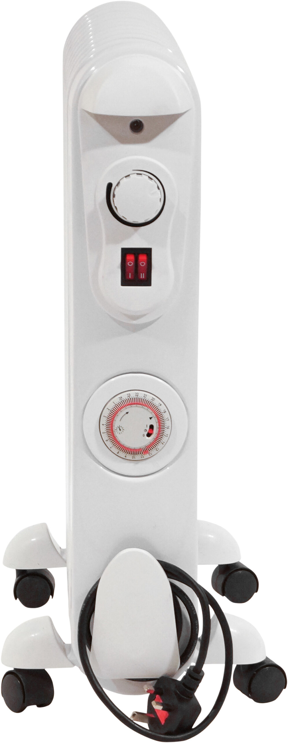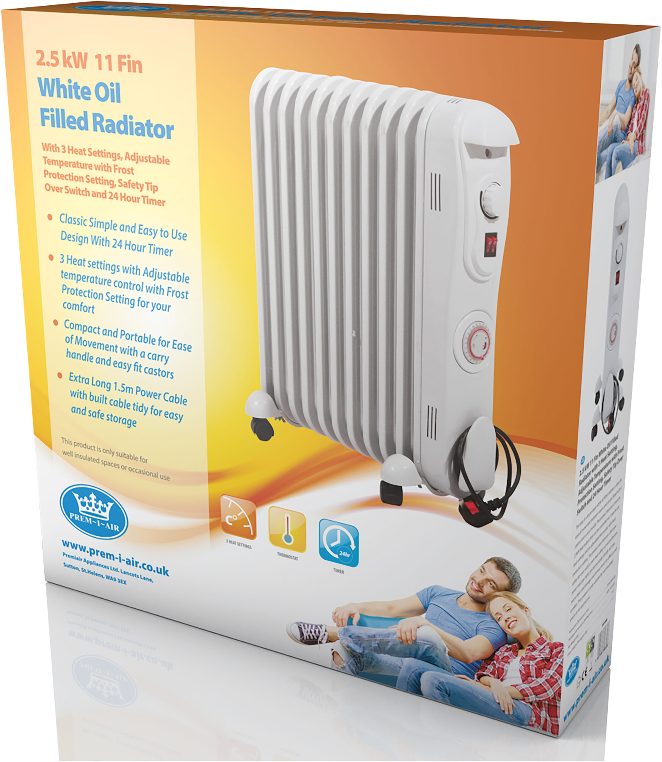 The Prem-I-Air 2.5 kW 11 fin oil filled radiator with 24 Hour Timer features 3 heat settings, an adjustable thermostat, over-heat safety cut-out, a power indicator light, durable castors, environmentally friendly oil, a built-in carry handle and power cord storage. This product is only suitable for well insulated spaces or occasional use.