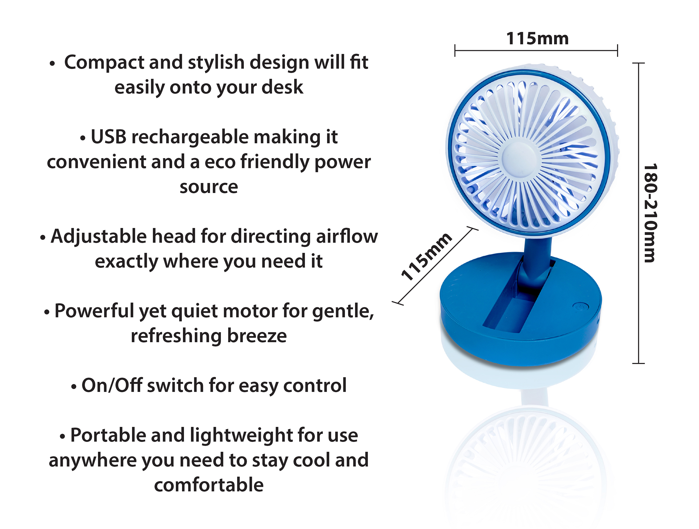 Stay cool and comfortable at your desk with the Compact USB Rechargeable Desktop Fan with Adjustable Head! This compact and stylish fan is designed to bring relief from the heat, and it’s the perfect solution for hot summer days.Featuring a powerful yet quiet motor, this fan generates a gentle breeze to keep you cool and comfortable, and the adjustable head allows you to direct the airflow exactly where you need it. The fan can be powered via USB, making it easy to use and convenient to keep by your side. The compact design means it won’t take up too much space on your desk, and the adjustable head allows you to angle the fan exactly where you need it. Whether you’re working, studying, or just relaxing, this Compact USB Rechargeable Desktop Fan is the perfect solution for staying cool and comfortable.
