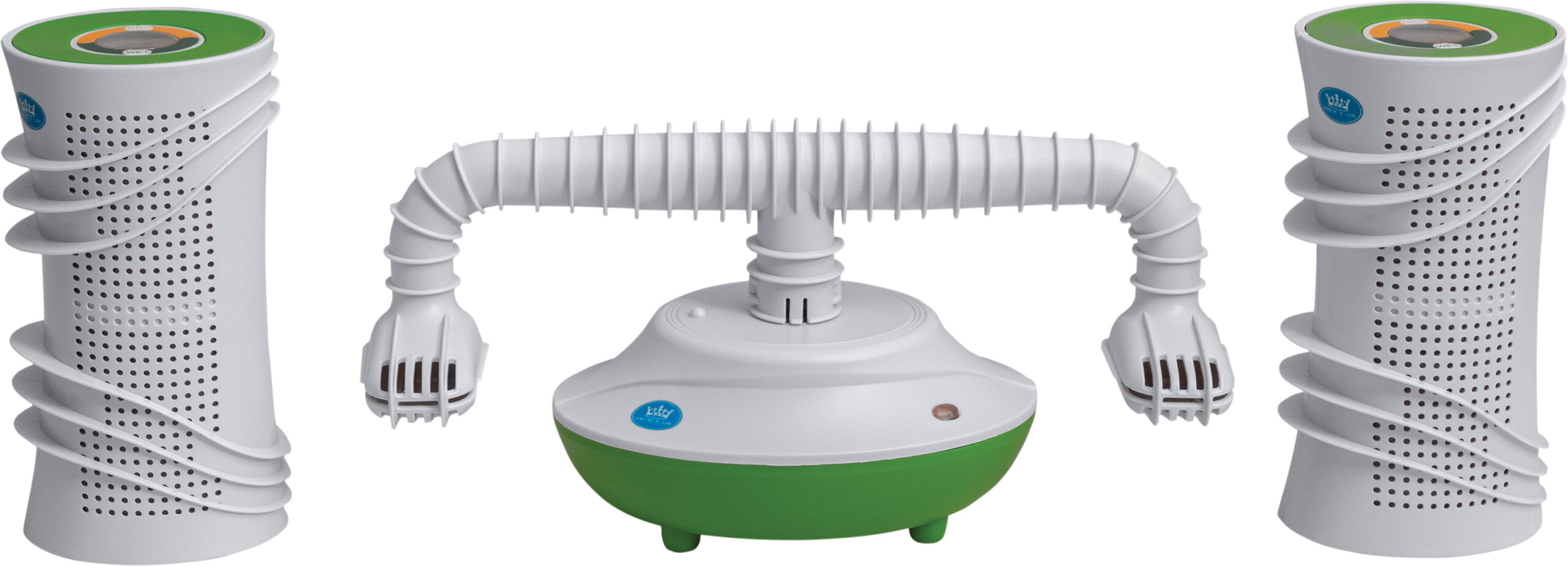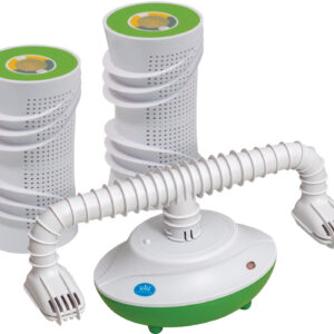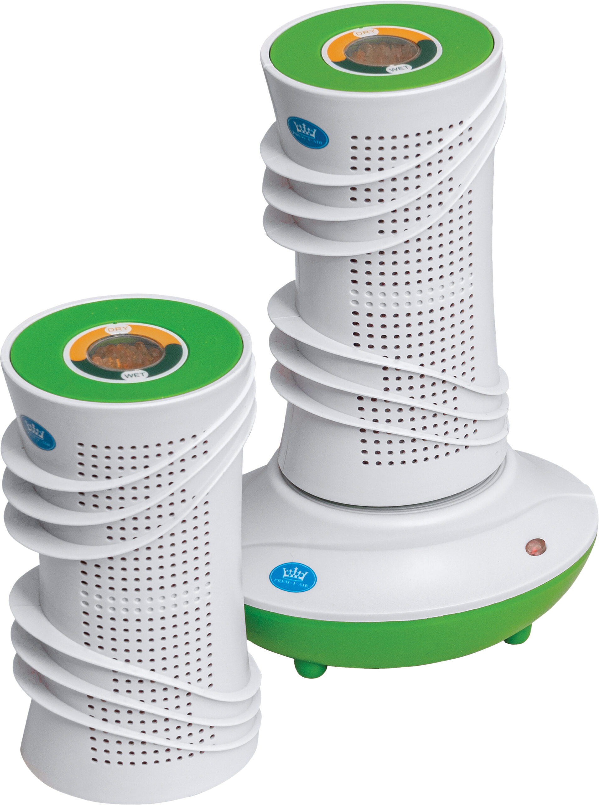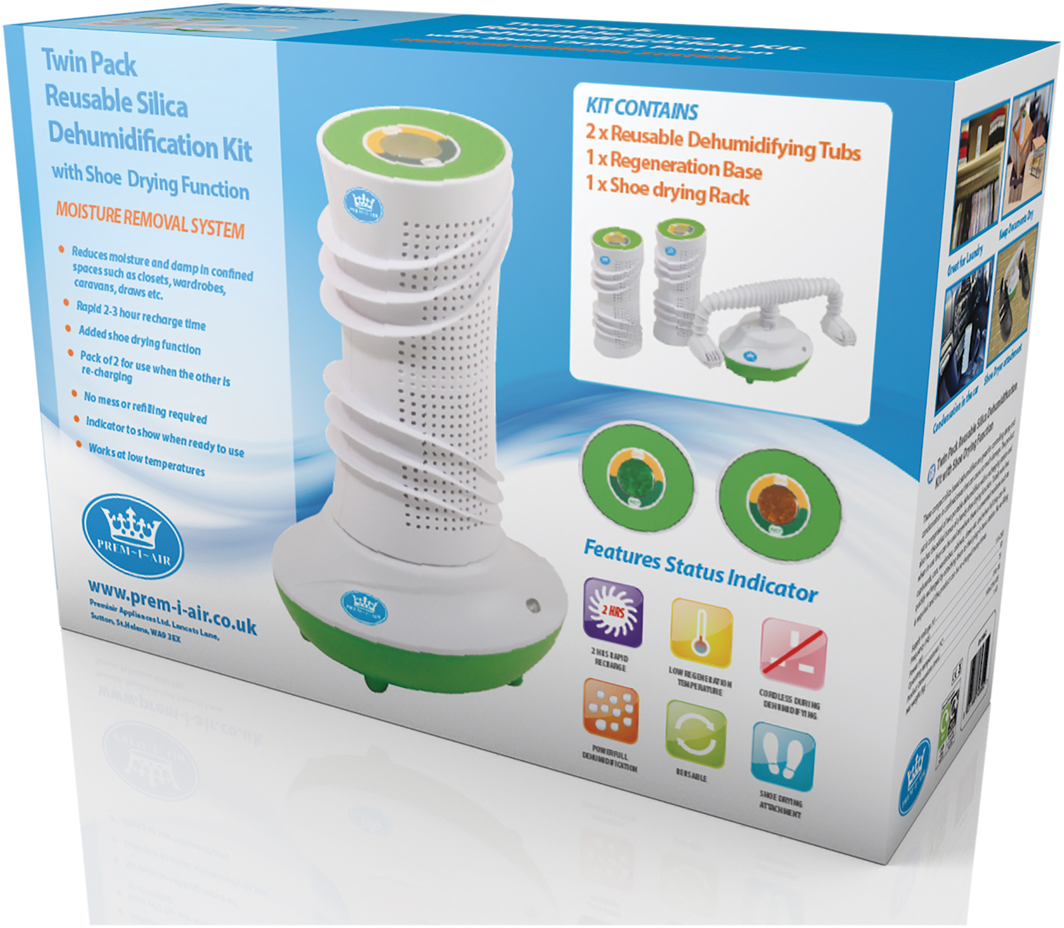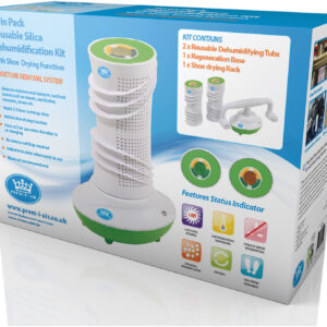Twin Pack Cordless rechargeable dehumidifier for absorbing moisture in a multitude of small spaces, ideal for use in cars, caravans, cabinets, boxes, sheds and wardrobes, requires No Batteries or Wires to Work. This compact product soaks up moisture from the surrounding area using the enclosed silica gel crystals. When fully absorbed the crystals in the indicator window on top of the unit will change colour from orange to green. Simply place the unit on the Super Fast Fan driven heating recharging station for 2-3 hours, when fully recharged the indicator crystals will turn orange again. This dehumidifier is completely wire free nor does it need batteries to work, this makes this type of dehumidifier completely portable and usable anywhere! The absorbent crystals do not need to be changed or refilled and the product can be re-charged many times. Also has the added bonus of a handy Fan driven shoe drying attachment. Simply place the Shoe drying attachment on the recharge station and hot air is blown into the shoes or training shoes to dry them out.