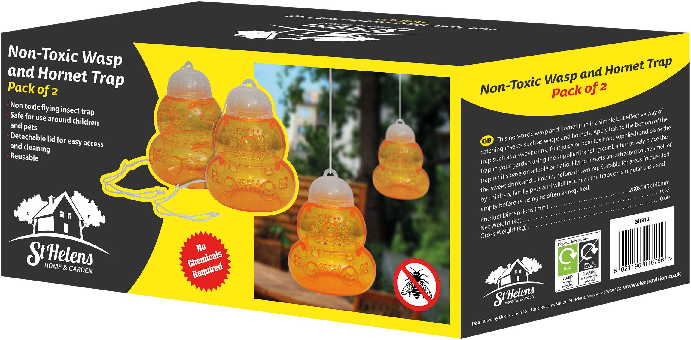 This non-toxic wasp and hornet trap is a simple but effective way of catching insects such as wasps and hornets. Apply bait to the bottom of the trap such as a sweet drink, fruit juice or beer (bait not supplied) and place the trap in your garden using the supplied hanging cord, alternatively place the trap on its base on a table or patio. Flying insects are attracted to the smell of the sweet drink and climb in, before drowning. Suitable for areas frequented by children, family pets and wildlife. Check the traps on a regular basis and empty before re-using as often as required.