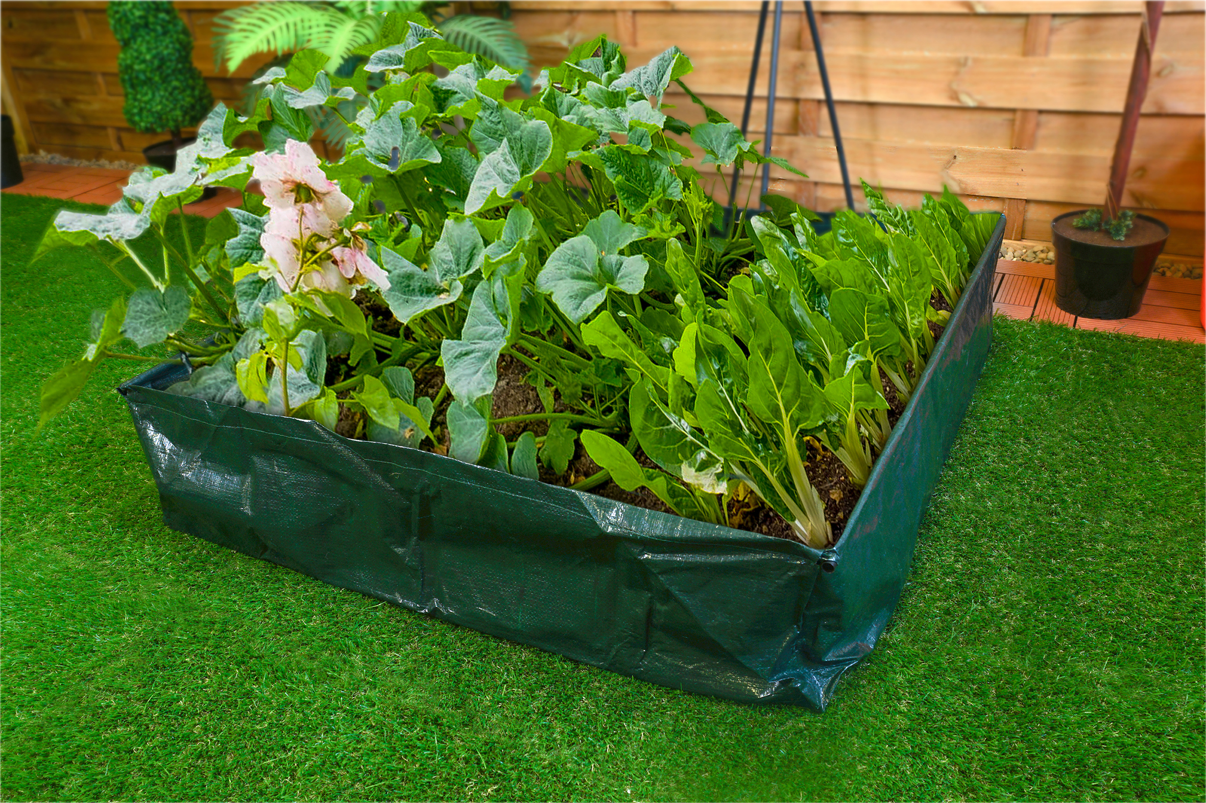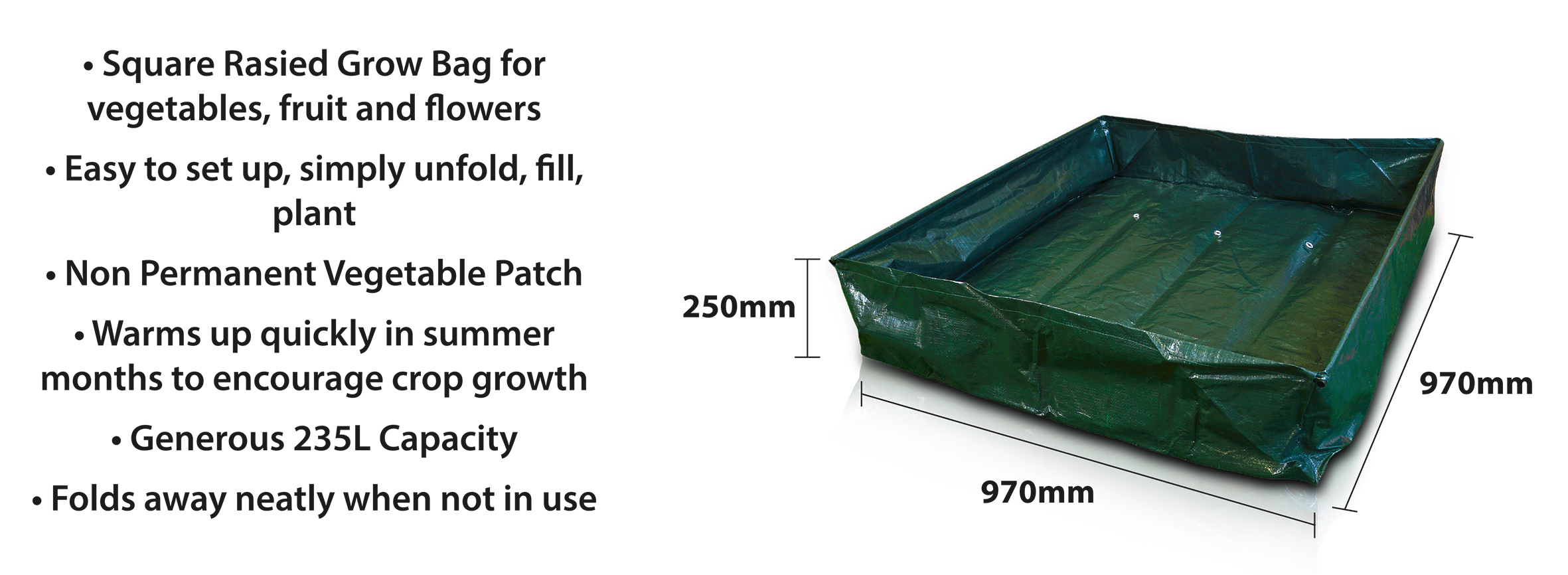 This raised square grow bag is perfect for growing plants, vegetables, herbs and fruit. The grow bag is extremely easy to set up, simply unfold, fill with compost or soil and plant. The grow bag is ideal for gardeners who do not wish to create permanent vegetable patches in their garden, in fact, the grow bag can be stored away when you have harvested your crop. The bag provides a very generous 1m x 1m x 0.23m of growing space. The bag becomes very warm during the spring and winter months providing the perfect growing environment for your crops or flowers, drainage is provided thanks to the material the bag is constructed from. As the bag is raised, protection is provided from ground burrowing animals such as moles. Generous 235L Capacity.